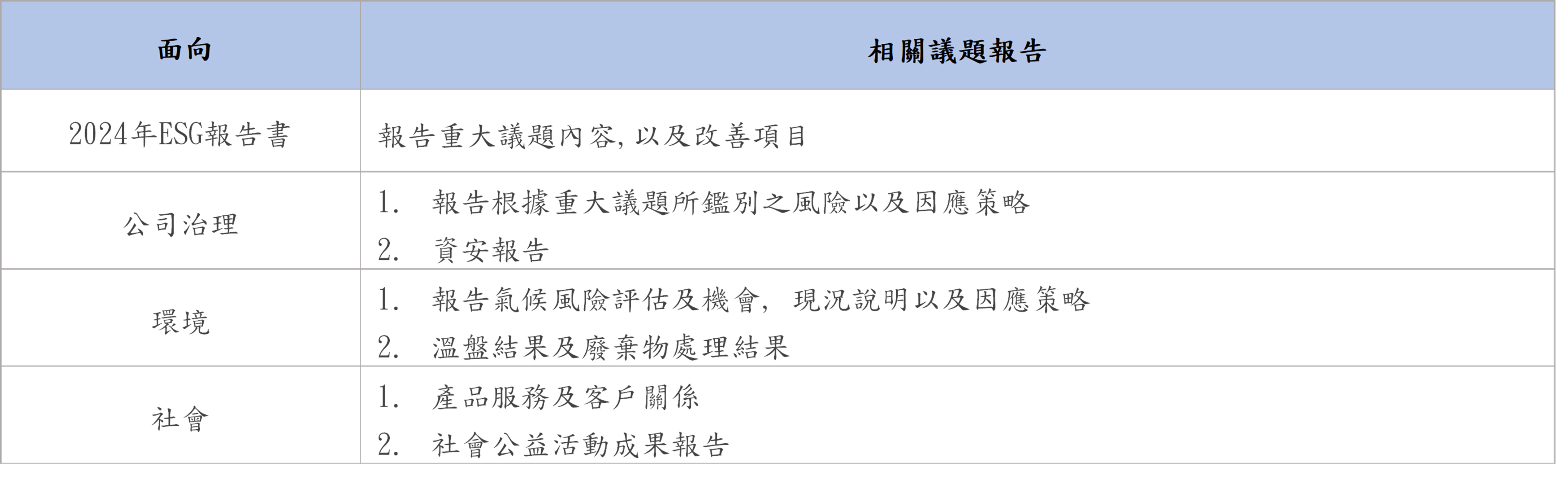 永續發展委員會於2025年7月30日召開會議, 根據鑑別的重大議題, 報告2024年度永續相關議題執行狀況, 並向董事會報告: