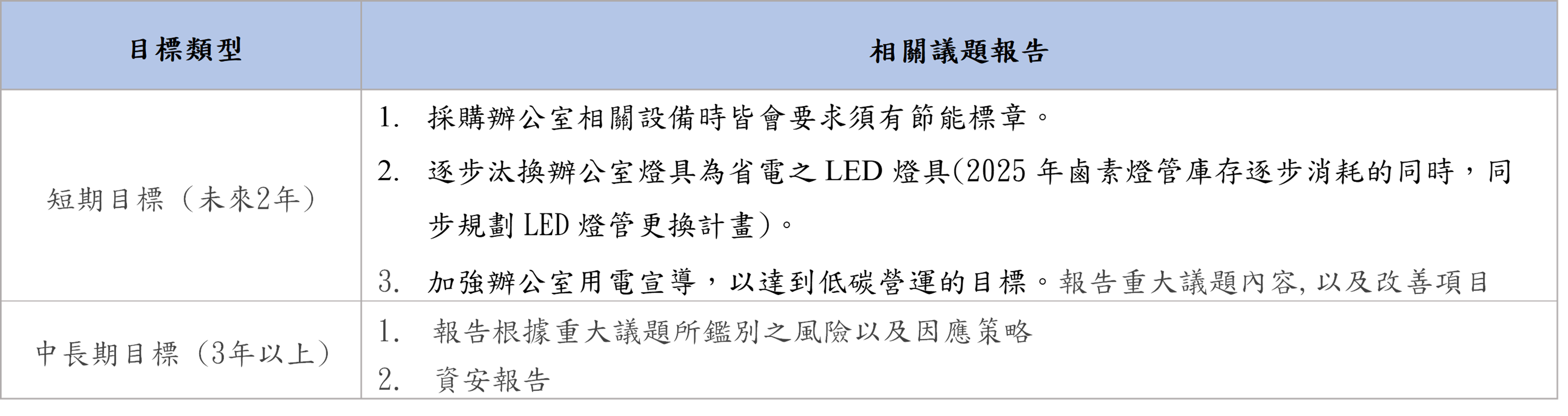 本公司於2024年公司進行氣候相關財務揭露,我們承諾將依照台灣「永續發展路徑圖」、「永續發展行動方案」持續遵守相關環保法令,並減少資源浪費、落實資源回收再利用,並訂定溫室氣體減量目標、策略及具體行動計畫之制定及確信作業,相關時程規劃如下: