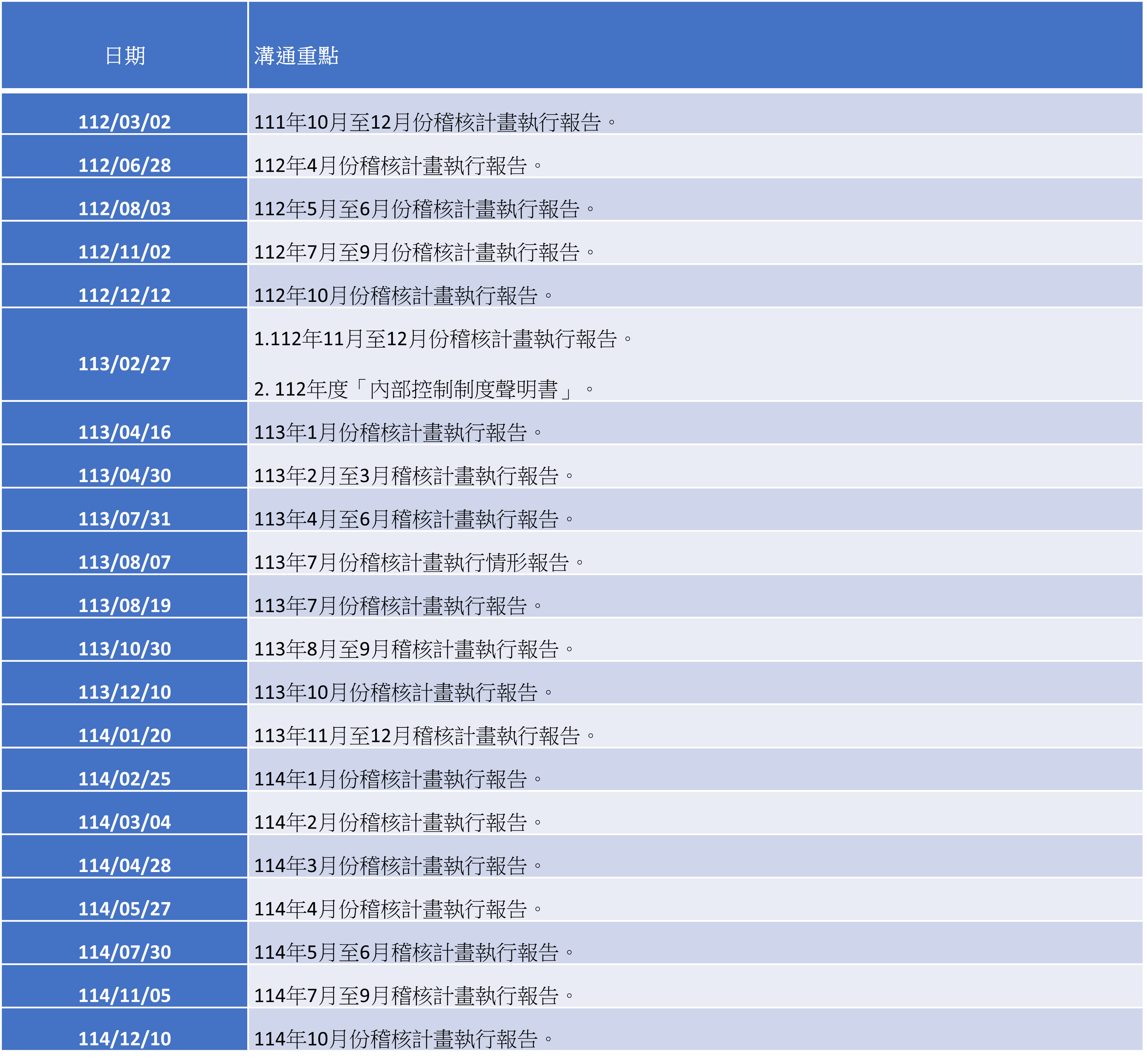 本公司內部稽核除在董事會例行會議報告外,並於定期或不定期向董事長、執行長報告。